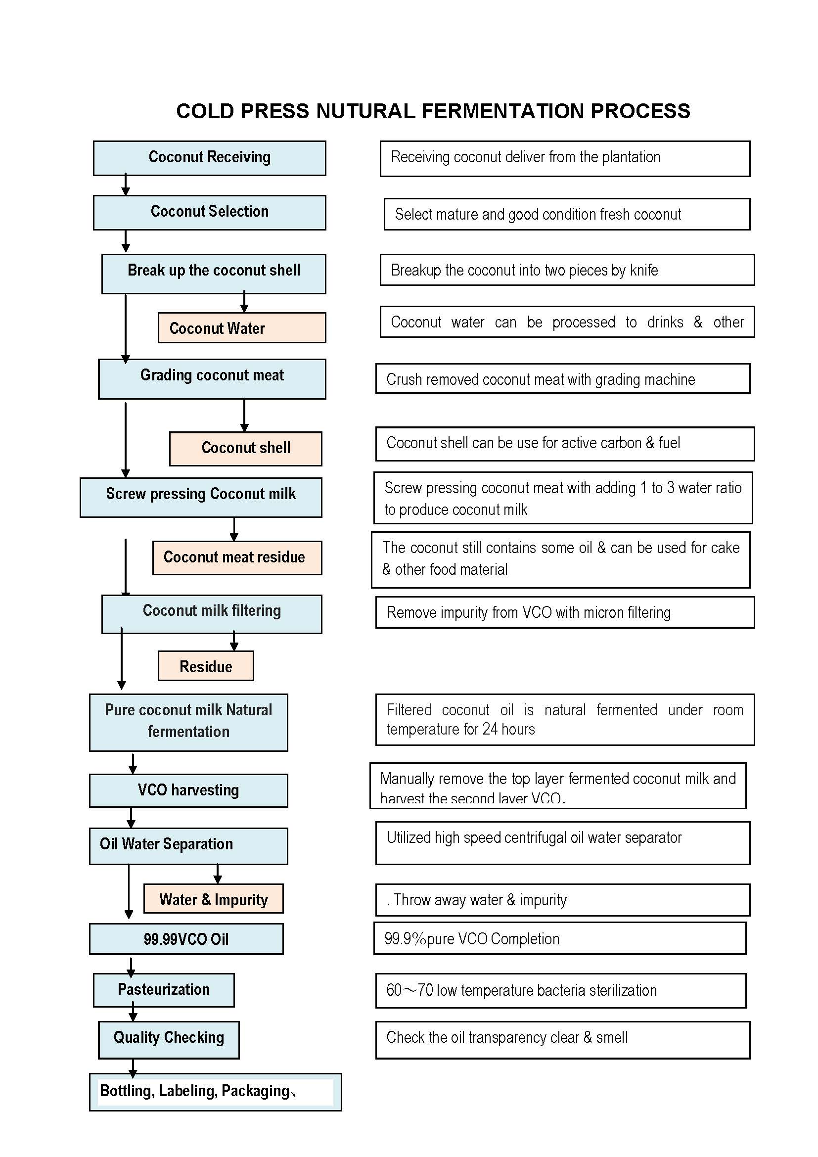 Maintain the Philippine traditional VCO Cold pressed & Fermentation Method, adapted to the latest food processing technology and standards of hygiene & safety. Produced good quality, taste & original nutrition. Consistent cultivation & production from 100 years old of experience in 100% Natural coconut plantation with no pesticide.